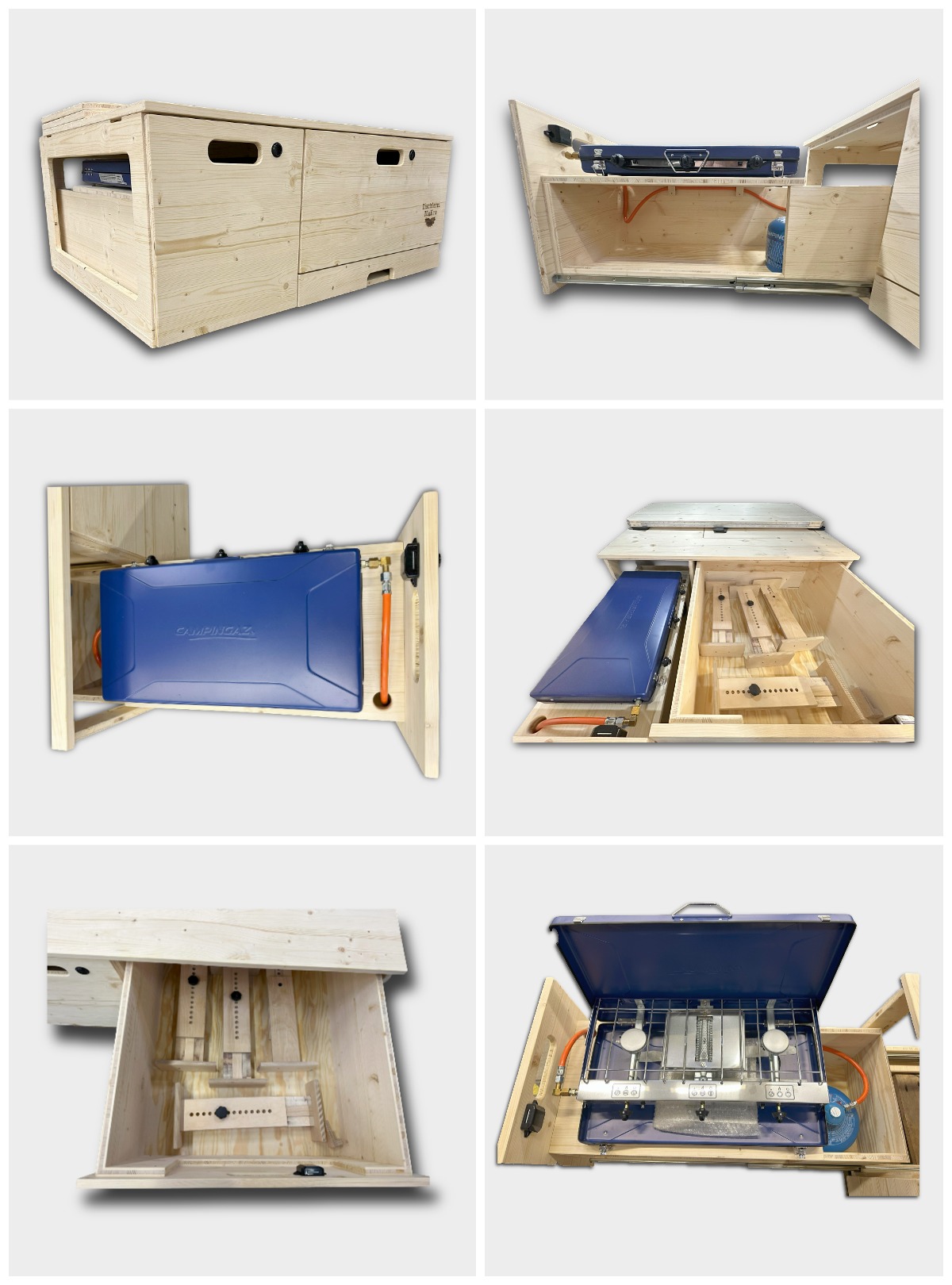 Die Box verfügt über einen integrierten Gasbrenner mit zwei Kochplatten und einer kleinen Grillfläche, jedoch ohne Gasversorgung.